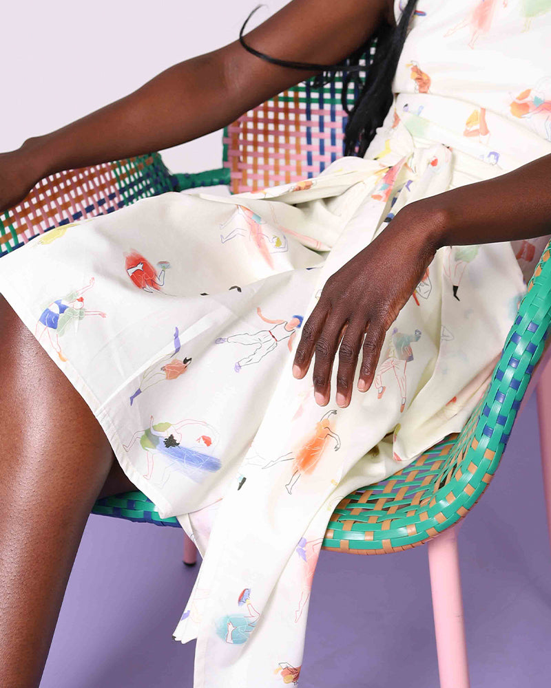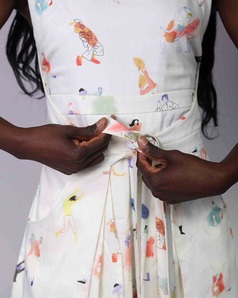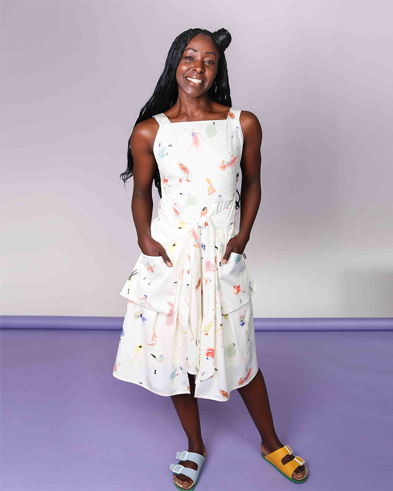 Apron dress with straps and generous pockets. A bright print featuring playful dancers.