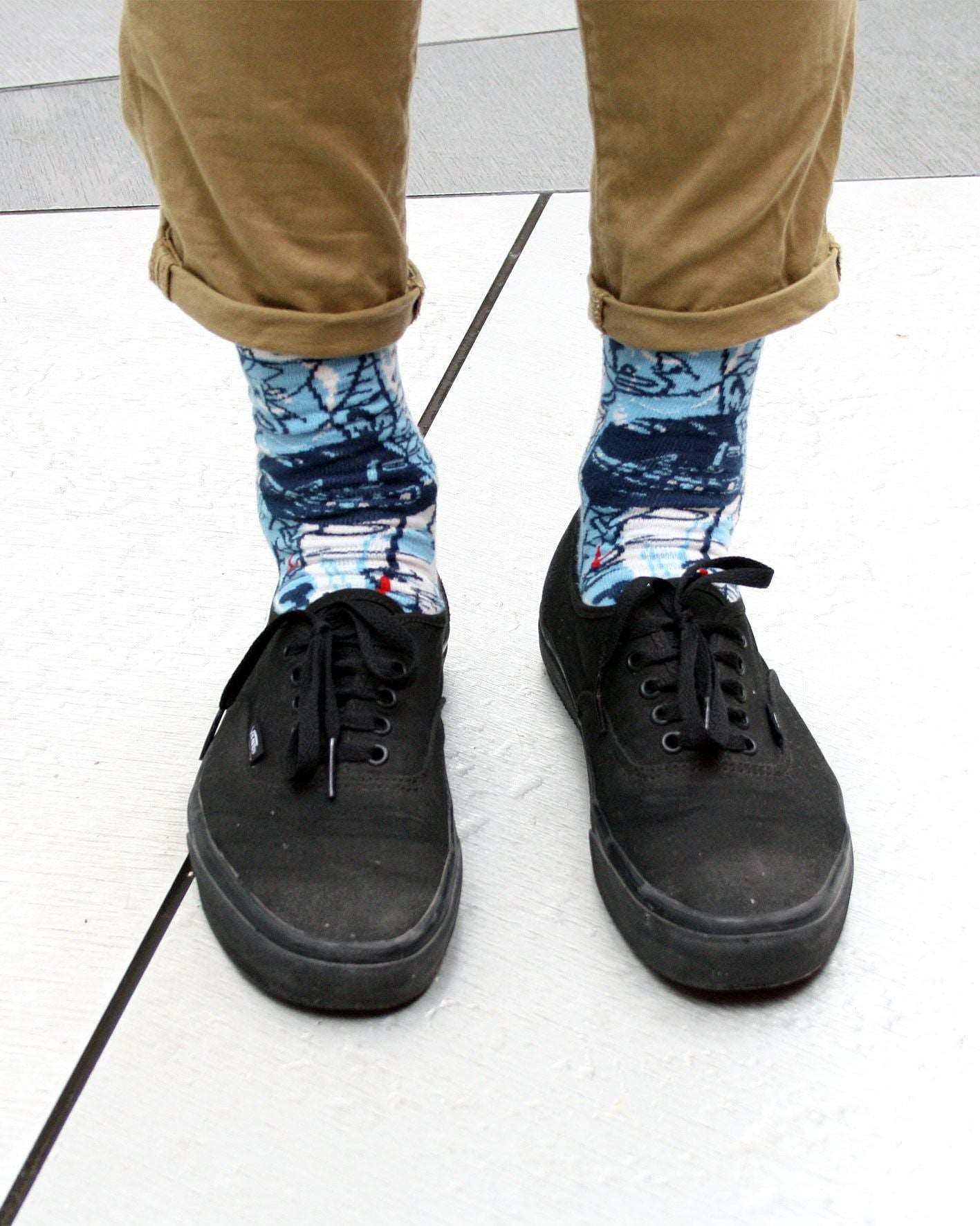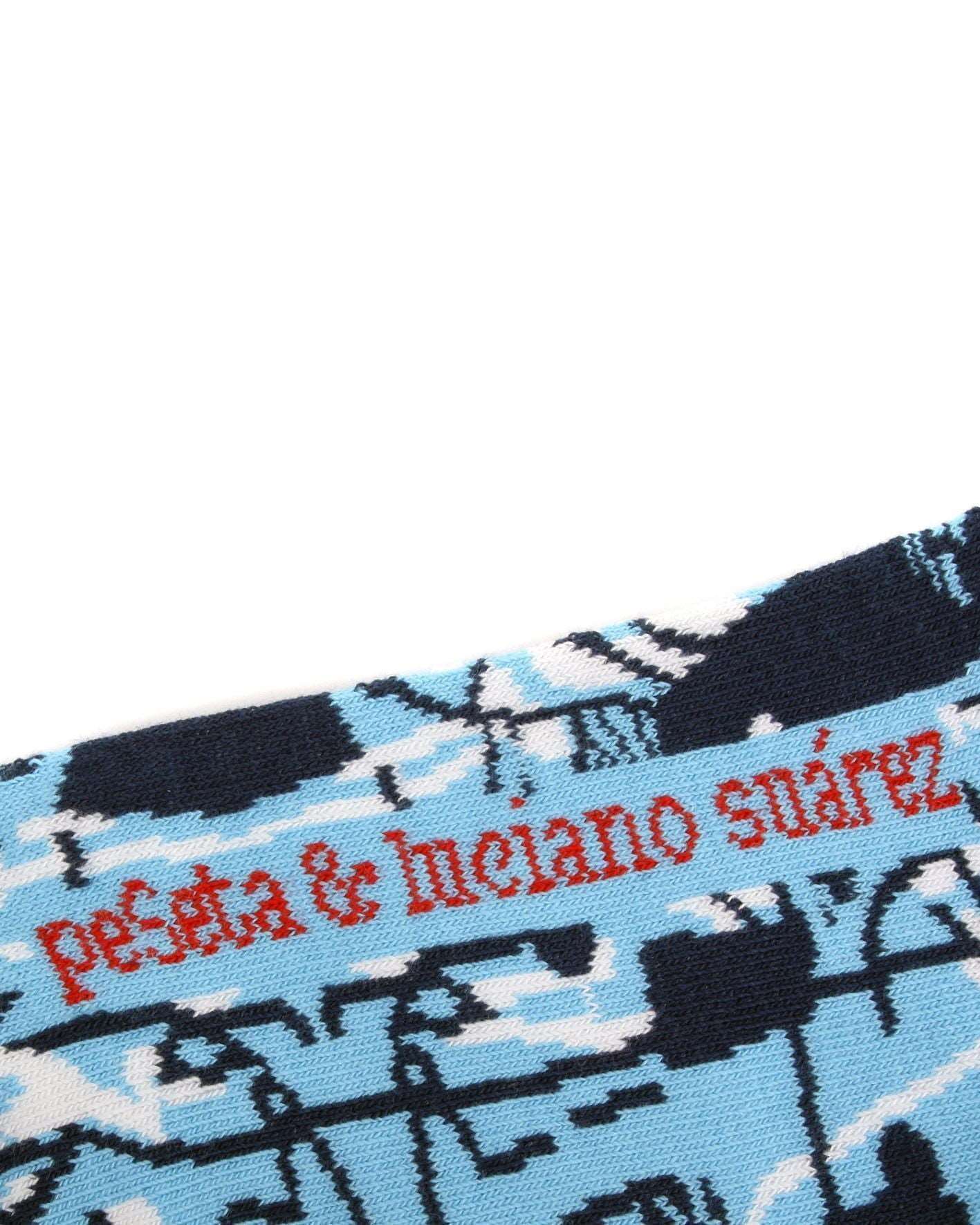 Calcetines azules con dibujos y líneas abstractas en azul oscuro. Diseño exclusivo para peSeta del pintor madrileño Luciano Suárez. Referencias mágicas, gnósticas y hebreas para temáticas tan oníricas como realistas.