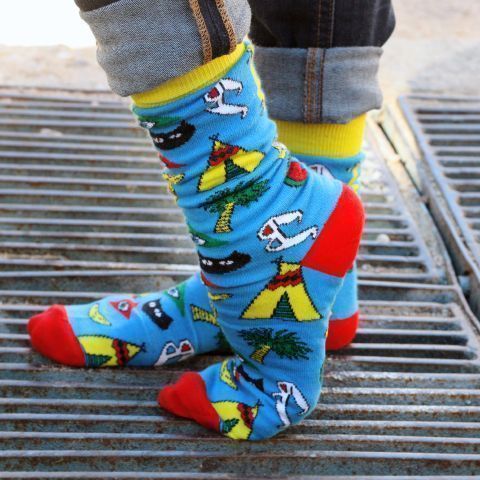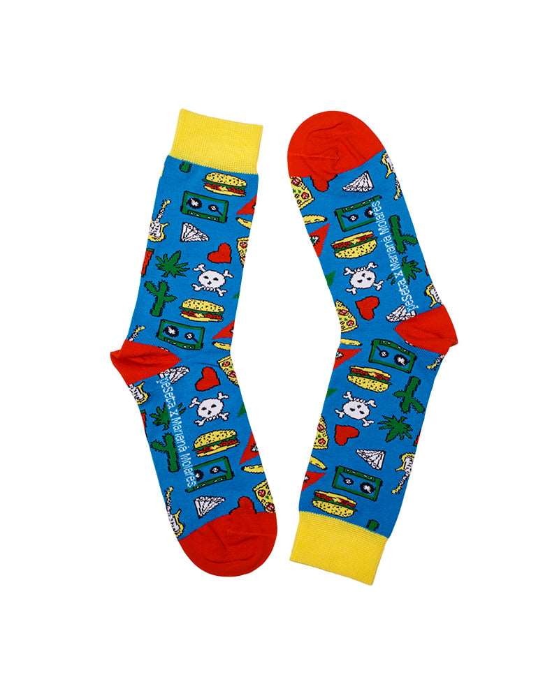 Calcetines azules con talón y punta rojos y muchos dibujos de elementos icónicos, como hamburguesas, calaveras, cactus, cassettes, diamantes o corazones… Diseñados por la artista Marina Molares para #10deditos, nuestra colección permanente de calcetines originales diseñados por artistas que admiramos.