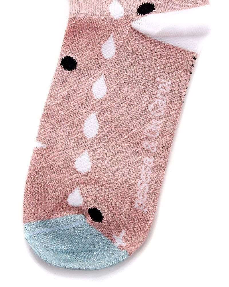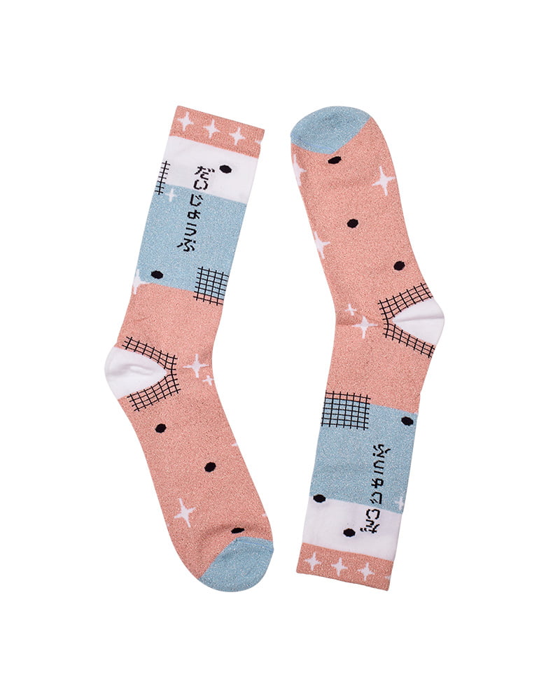 Calcetines brillantes con motivos japoneses diseñados para peSeta por Oh Caroool. Tonos rosa, celeste y blancos. Son los primeros calcetines que diseña y despliega sobre un fondo de brilli brilli sus composiciones y dibujos de inspiración japonesa. Más kawaii imposible.