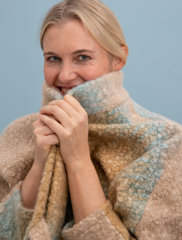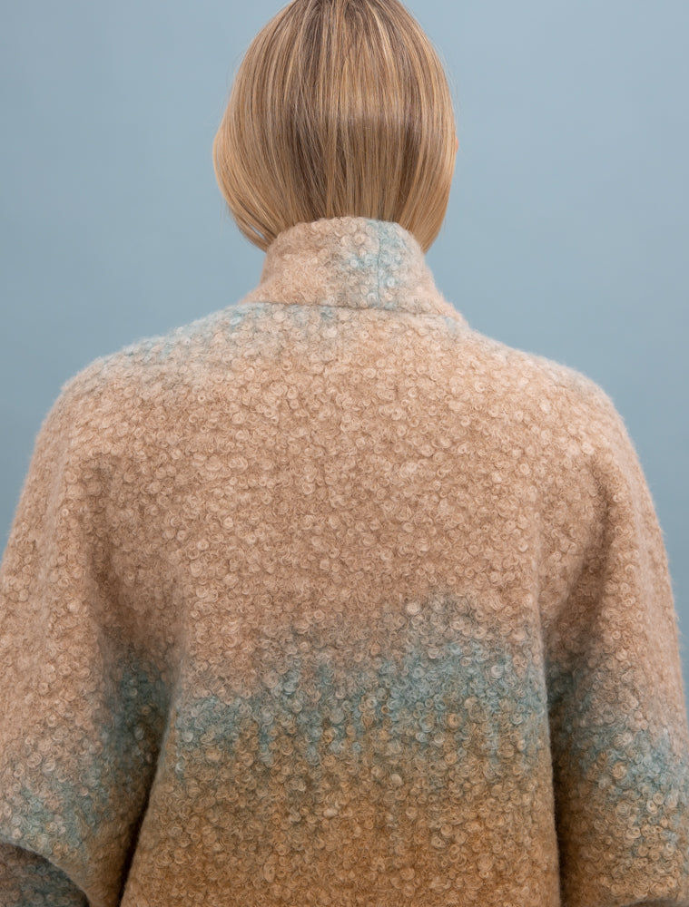 Chaquetón estilo kimono con cuello smoking y manga murciélago. Bolsillos muy amplios. Se ata cruzado.