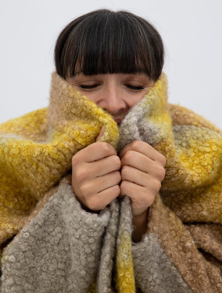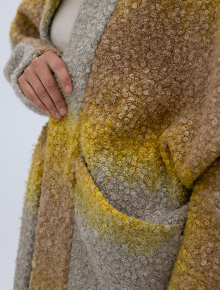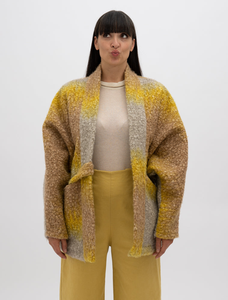 Chaquetón estilo kimono con cuello smoking y manga murciélago. Bolsillos muy amplios. Se ata cruzado.