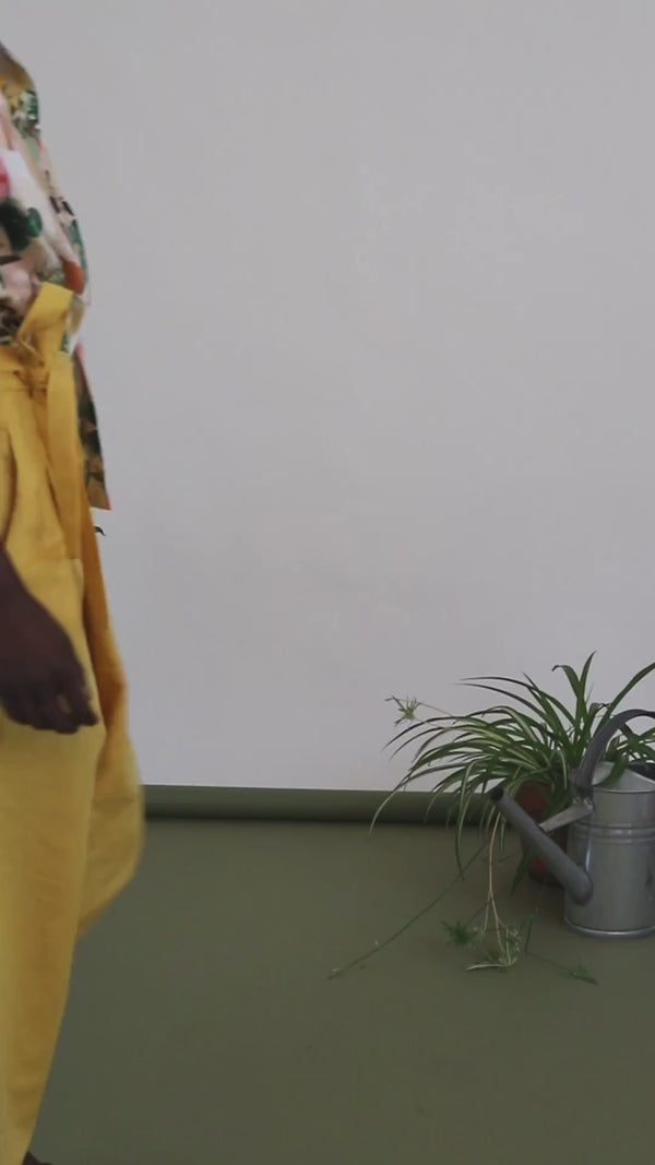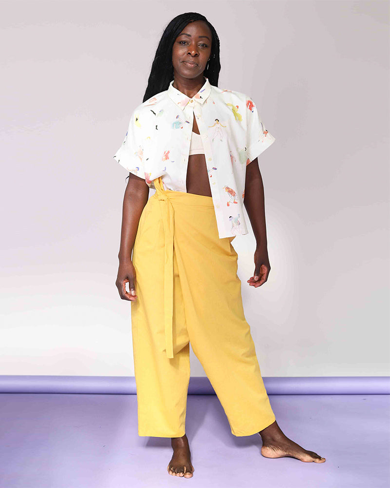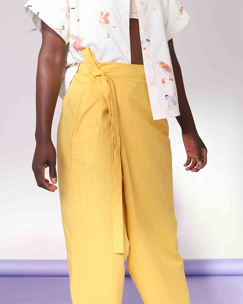 Pantalón amarillo liso cruzado con solapas delanteras y traseras. Producción responsable y sostenible en talleres locales y cooperativas donde conocemos en persona a quienes confeccionan las prendas.