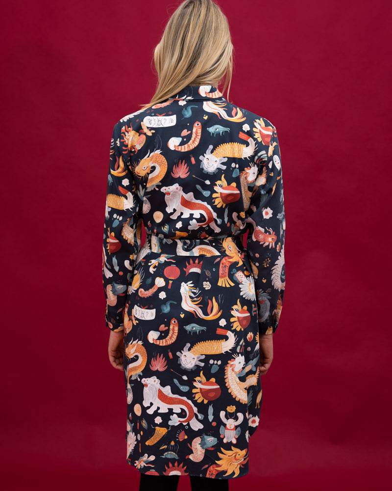 El vestido lleva botones ocultos debajo de la tapeta hasta abajo y puede llevarse tanto cerrado como abierto tipo blusón.